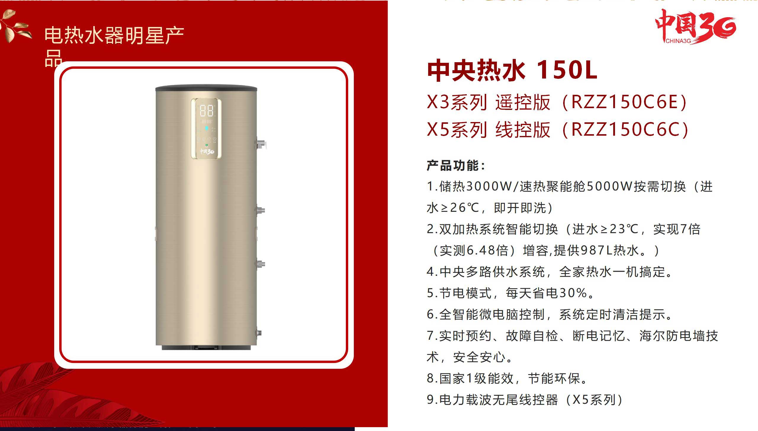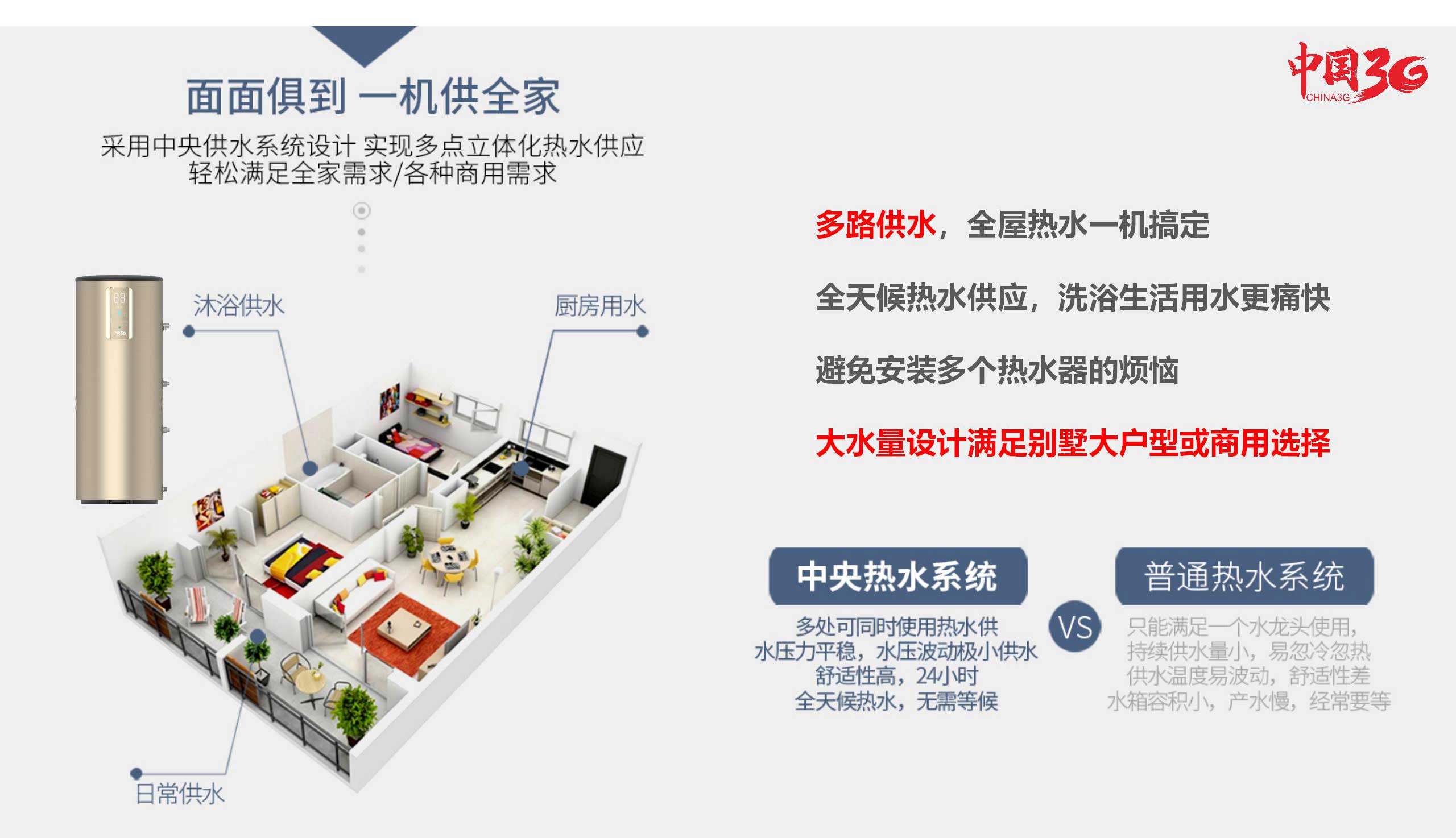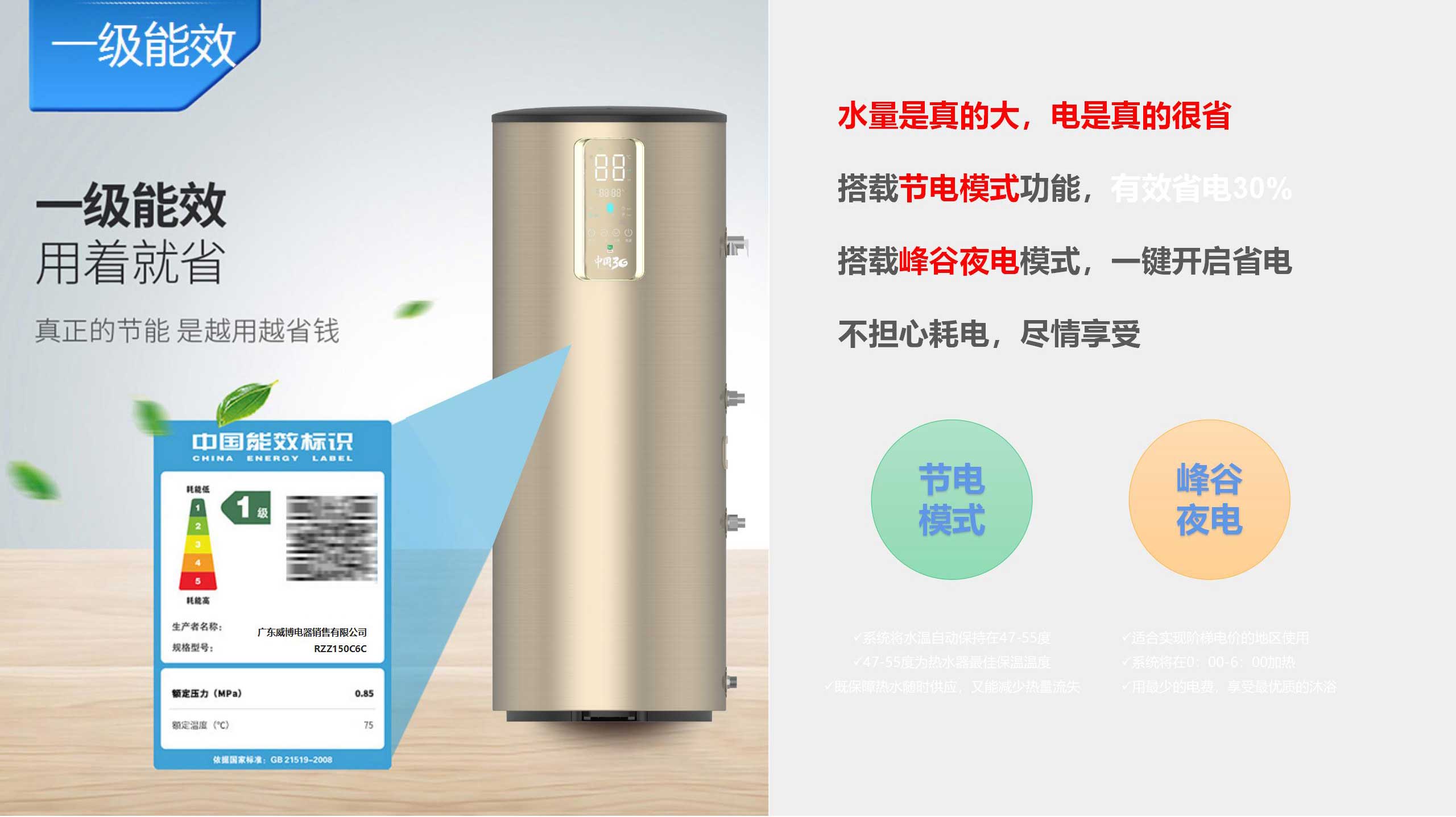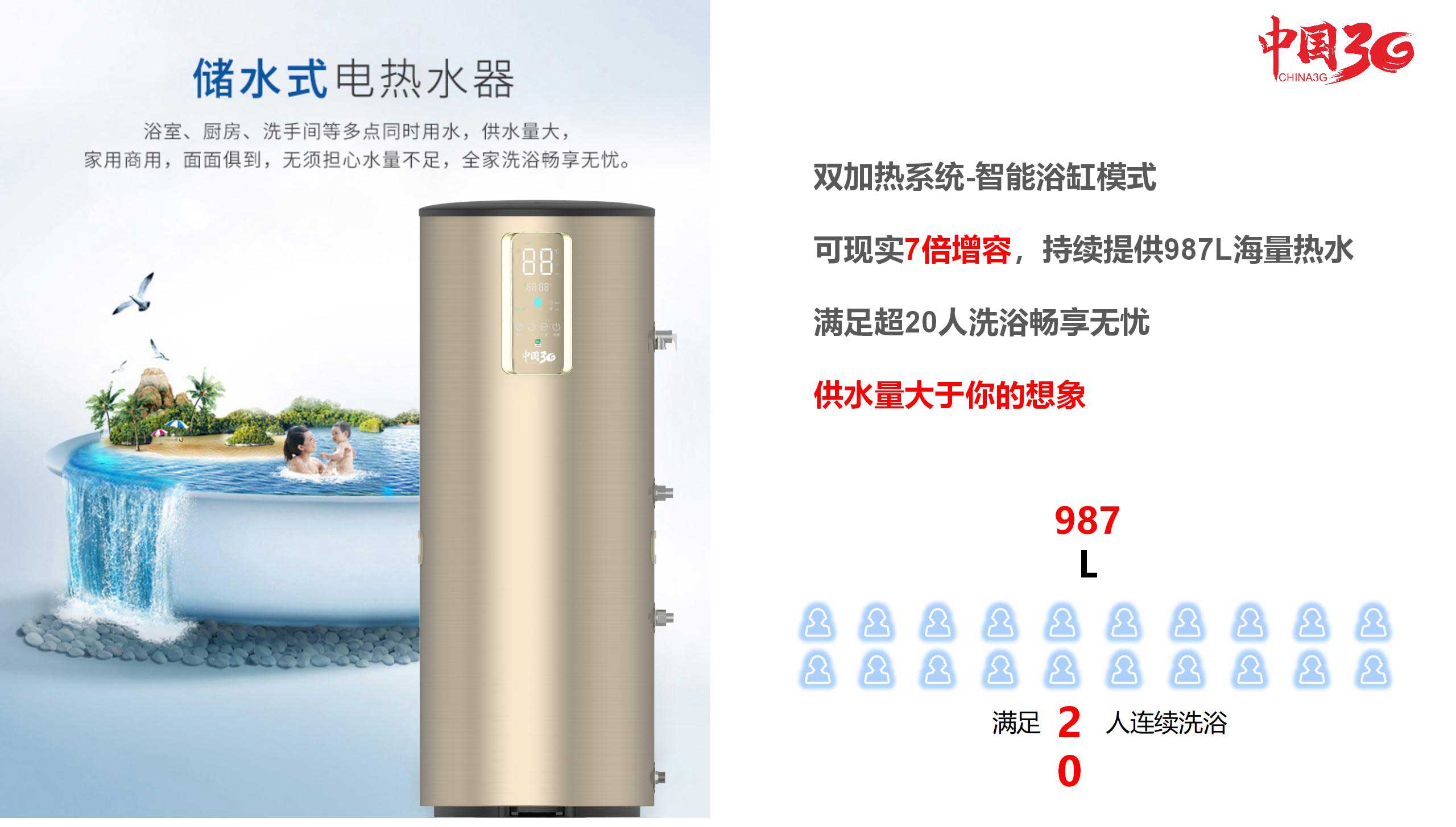 2.双加热系统智能切换(进水≥23℃,实现7倍增容,提供987L热水。)