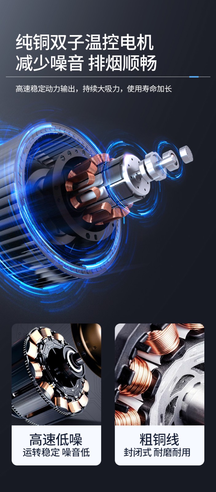 5、纯铜双子温控电机,平衡稳定,10年不坏。