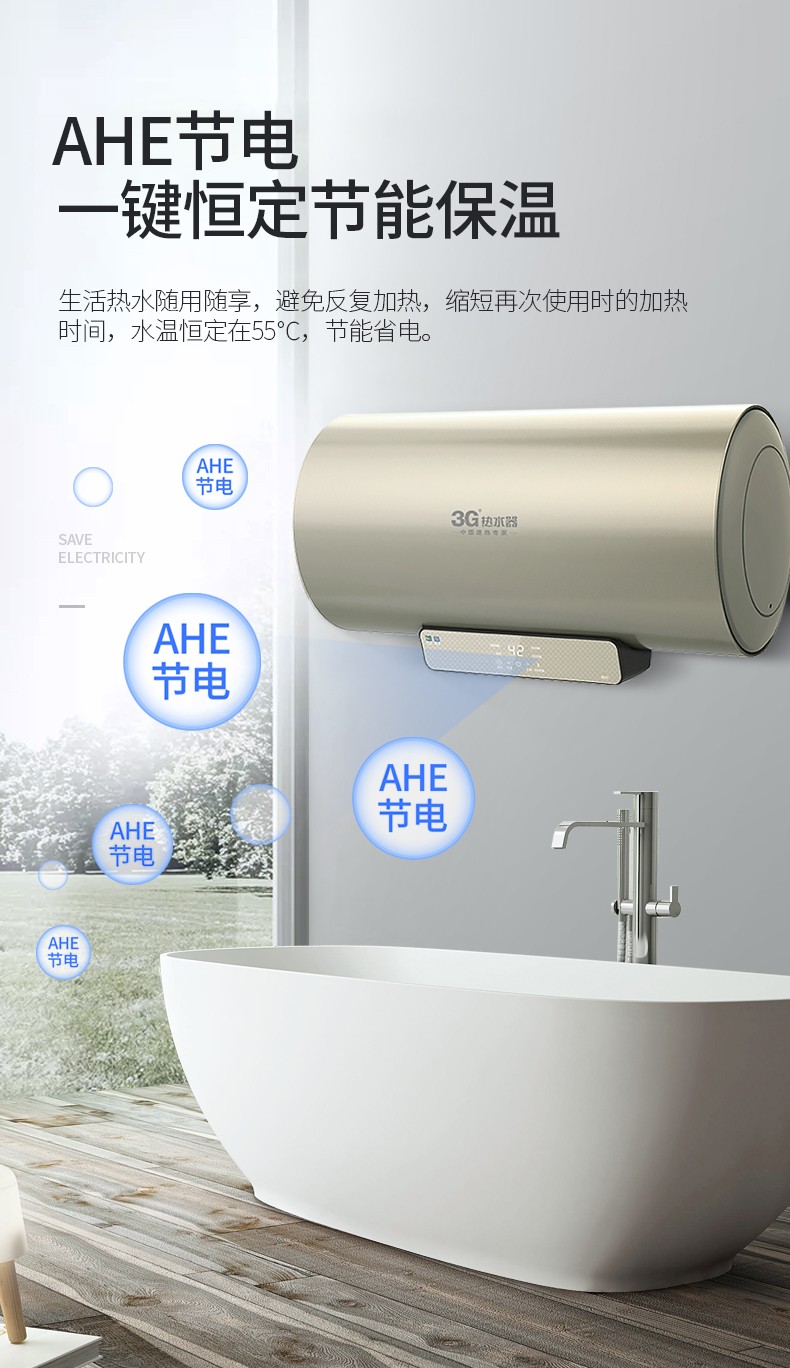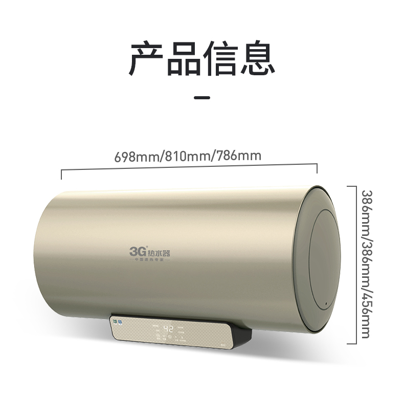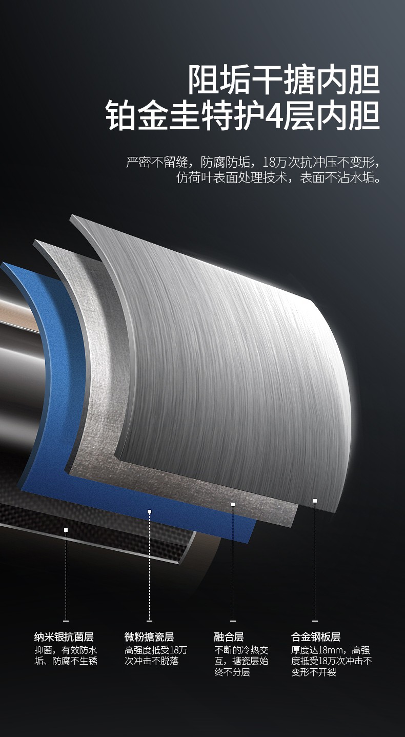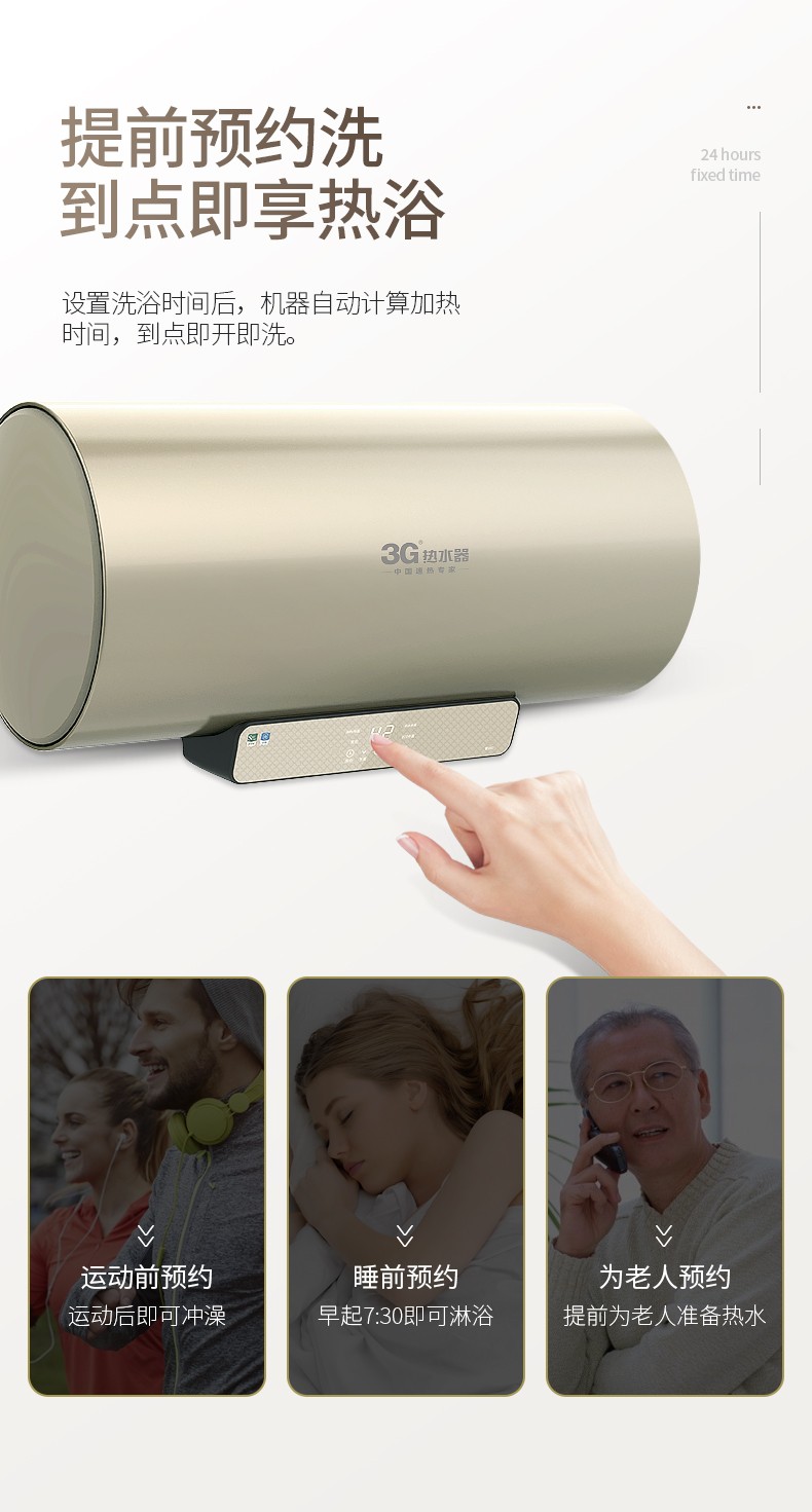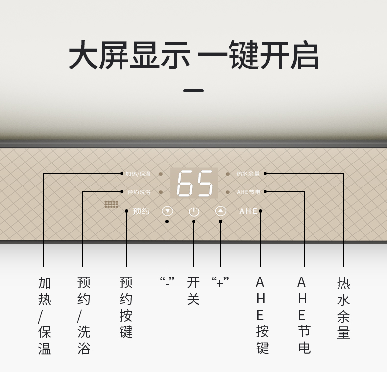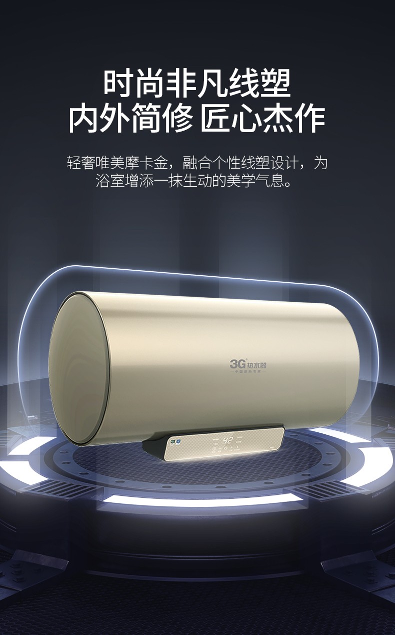 2、时尚摩卡金,智能预约,一键遥控,告别手触时代;双八数显,热水余量提示。