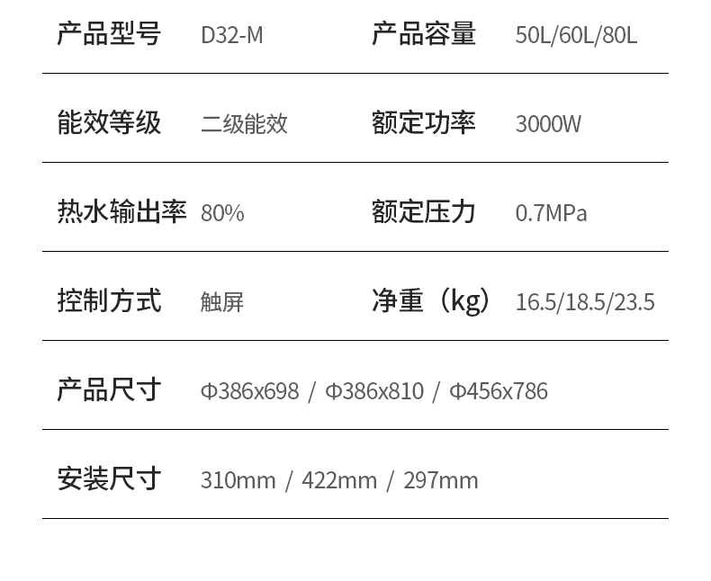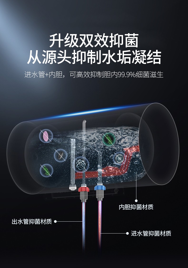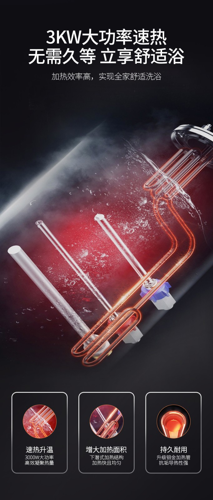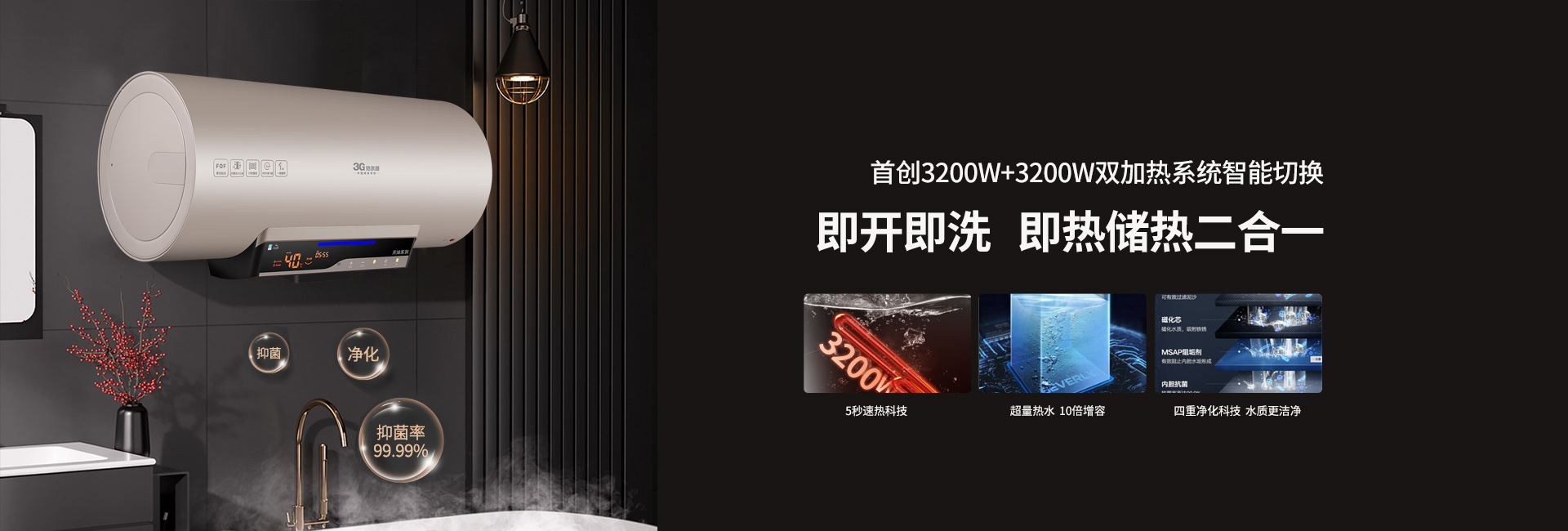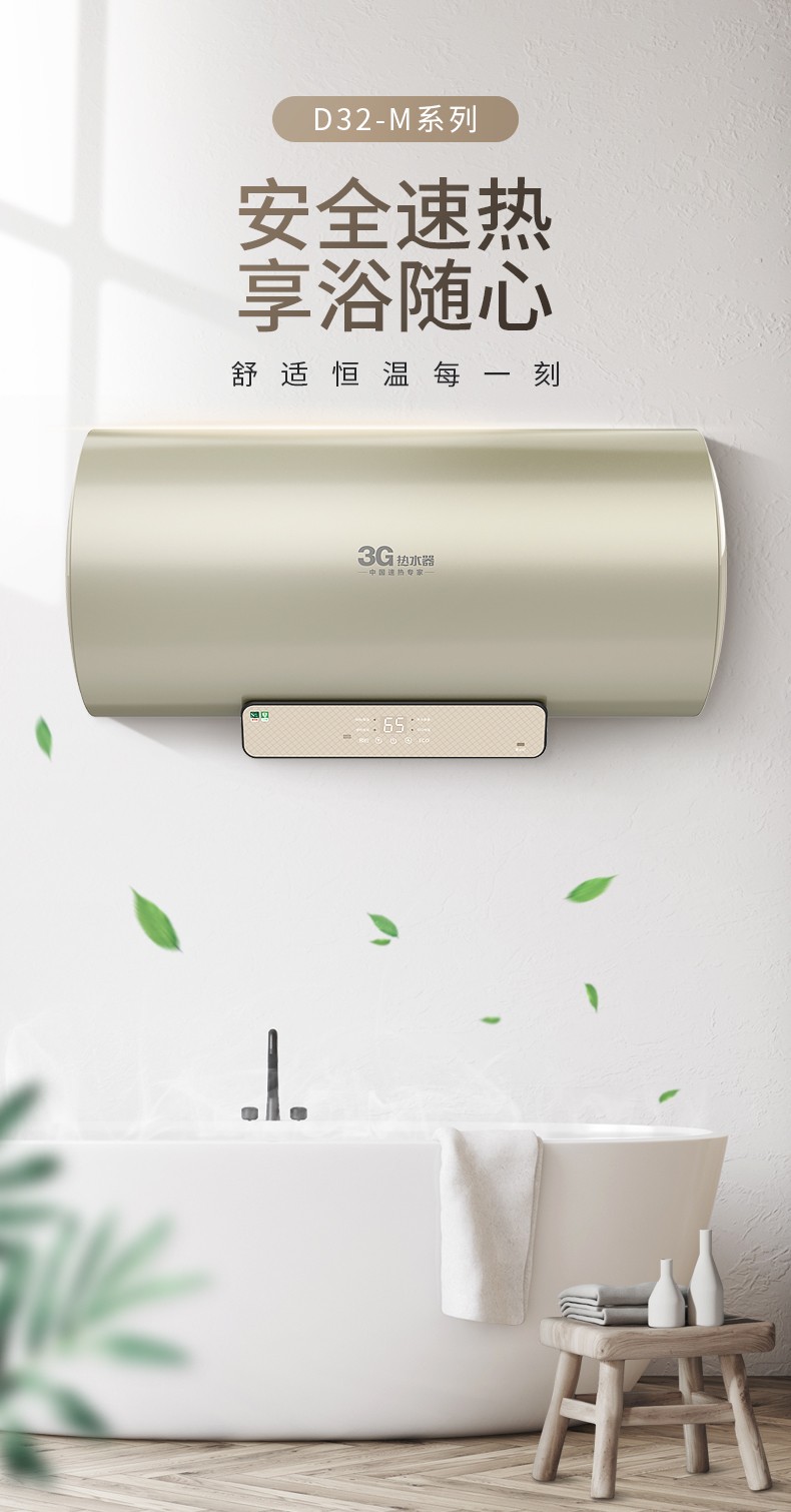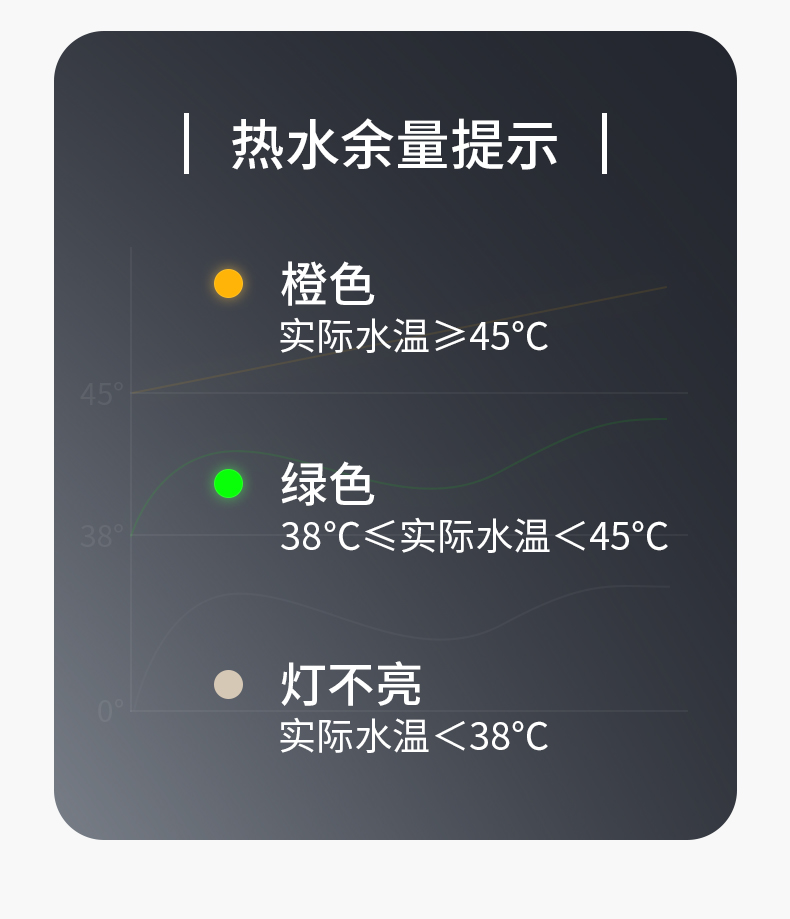 2、时尚摩卡金,智能预约,一键遥控,告别手触时代;双八数显,热水余量提示。