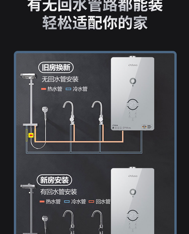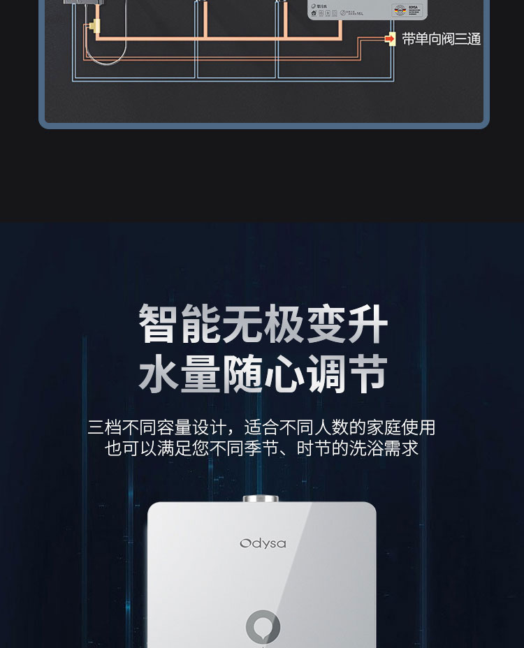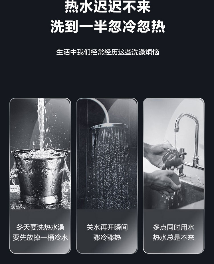 1、零冷水直流循环技术:0等待、0浪费、热水即开即来。