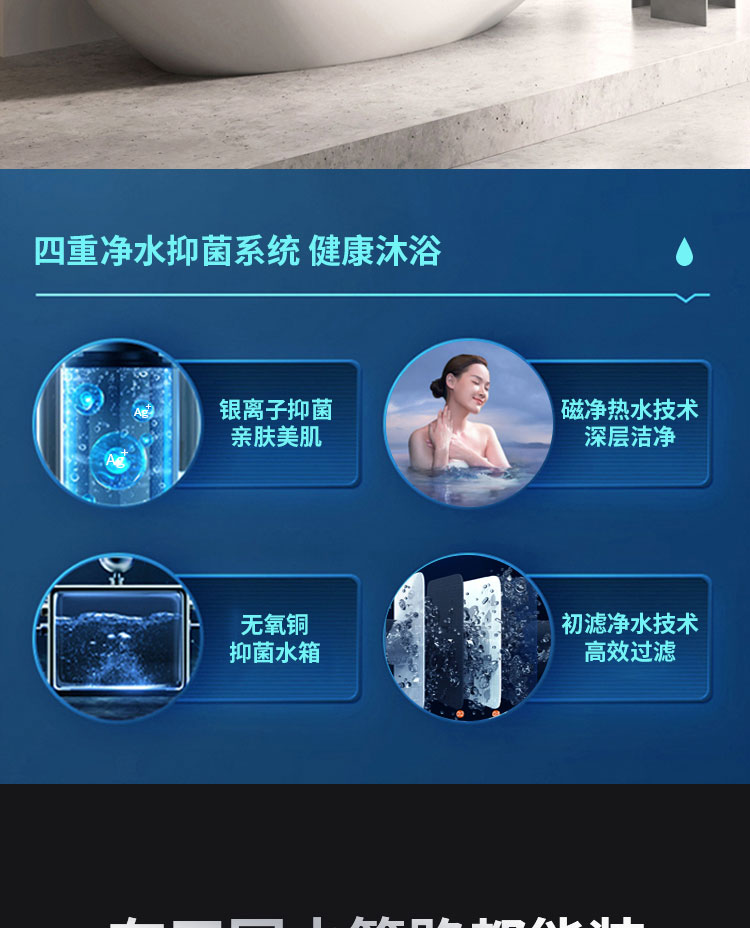 4、四重净水抑菌系统:磁净热水、银离子抑菌等净水抑菌,抑菌率高达99.9%。
