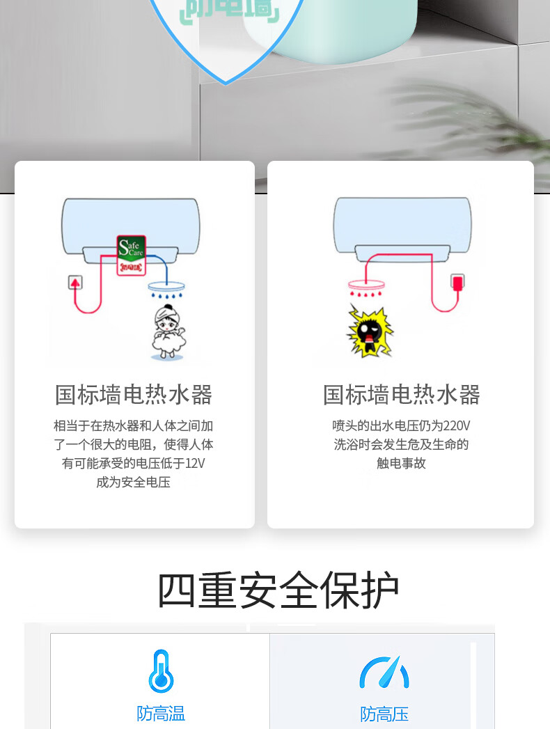 1、专利防电墙+机身全绝缘:100%安全、不烧电源线,全屋家电漏电预警。