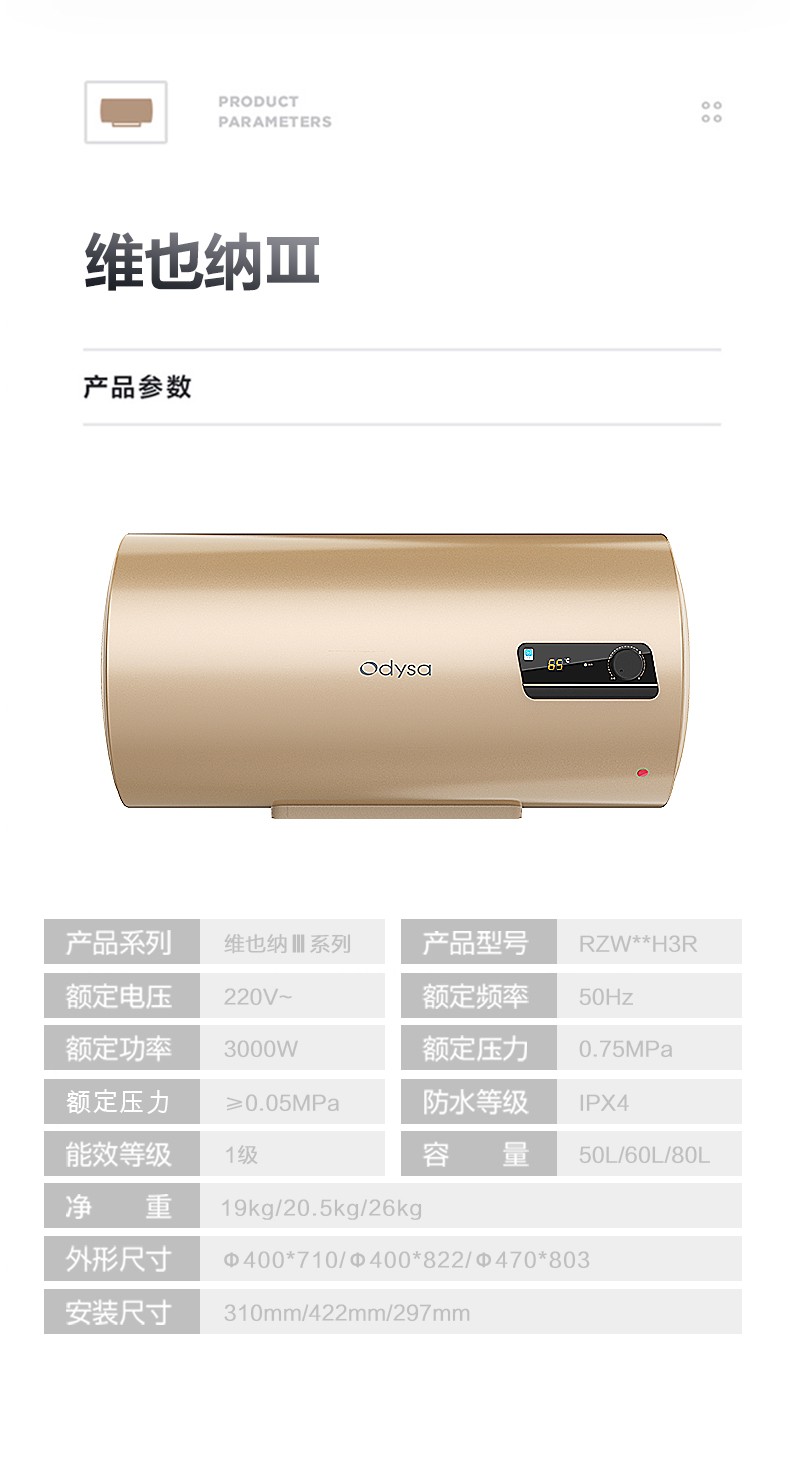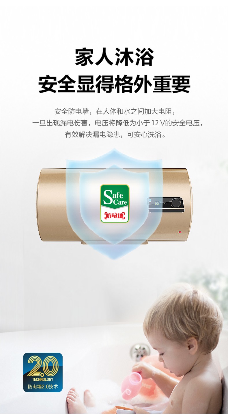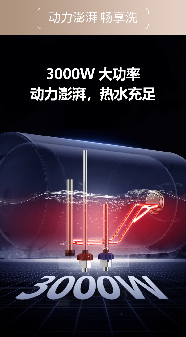 1、3000W双管分层速热:快速升温,洗浴不久等。
