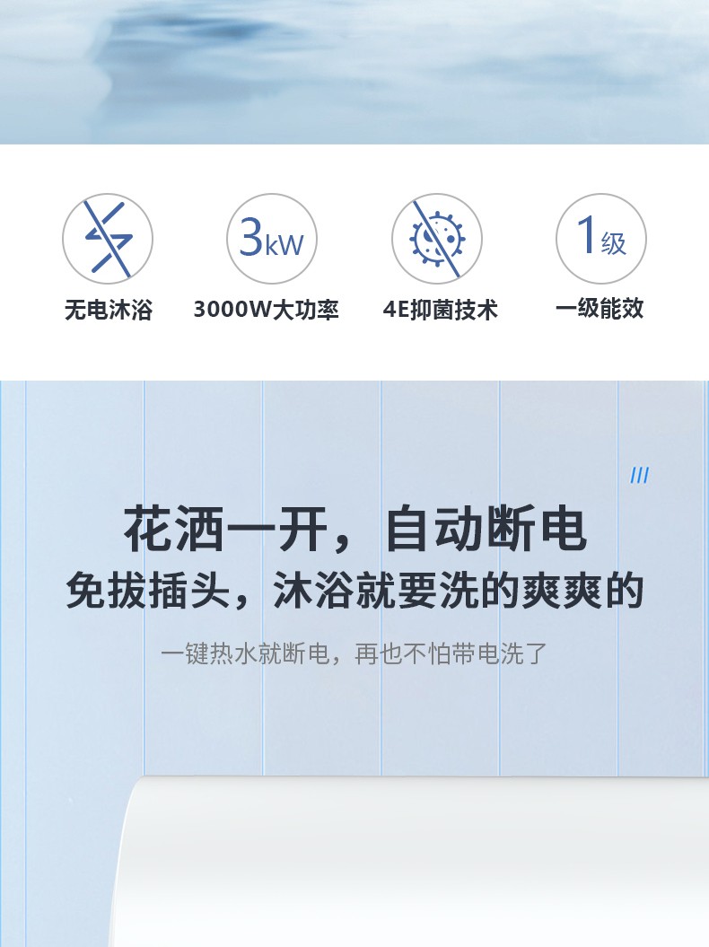 1、出水即断电:安全看得见、洗浴不用拔插头。(可开可关)